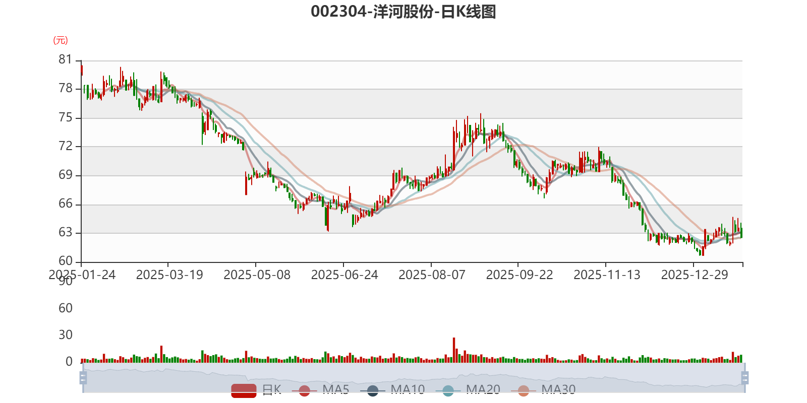 中证智能财讯洋河股份(002304)1月23日晚间透露2025年度事迹预报,瞻望2025年归母净利润21.16亿元至25.24亿元,同比下落62.18%-68.3%;扣非净利润瞻望18.53亿元-22.61亿元,同比下落66.92%-72.89%;基本每股收益1.4045元/股-1.6752元/股。以1月23日收盘价诡计,洋河股份现在市盈率(TTM)约为37.34倍-44.54倍,市净率(LF)约1.94倍,市销率(TTM)约4.84倍。