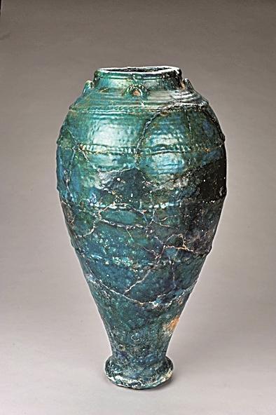 r它们器形硕大,高度接近80厘米,状如诞生的橄榄,名义施有一种介于蓝绿之间的釉色,犹如孔雀尾羽般璀璨,是我国最早发现的孔雀蓝釉类器物。