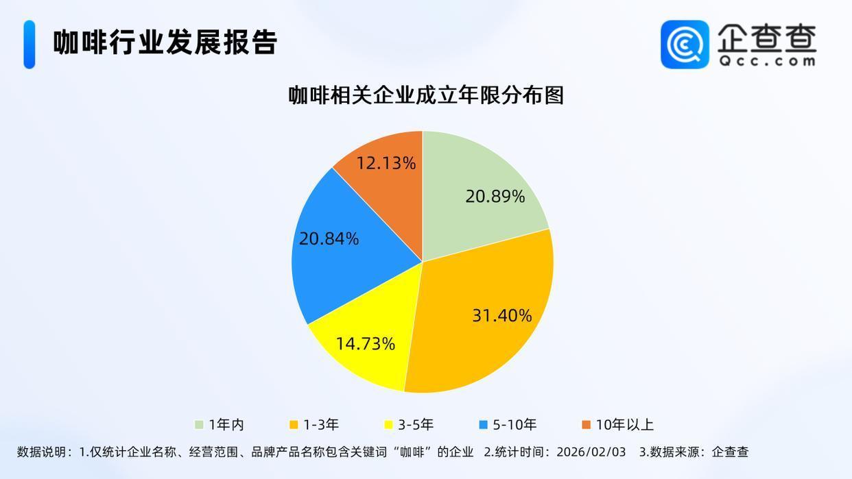 企查查数据流露,从策动时辰来看,咖啡相干现有企业多诞生于近三年,诞生年限在1-3年的相干企业最多,占比31.40%。其次,诞生年限在1年内的咖啡相干企业占比20.89%。