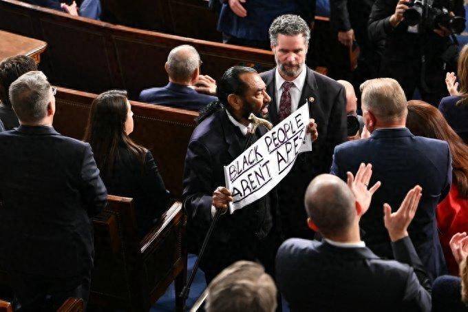 特朗普刚启动发扮演讲时,遭到得克萨斯州民主党众议员格林抗议,格林就地被带离场。