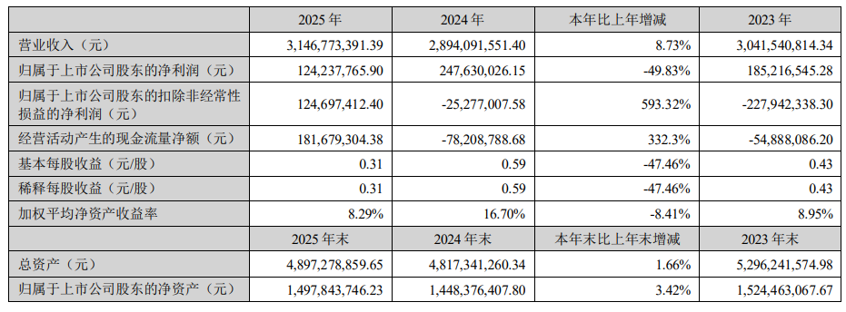 3月20日晚间,宝鼎科技(002552)公布2025年年报,公司营业收入为31.47亿元,同比上升8.73%;归母净利润为1.24亿元,同比下落49.83%;扣非归母净利润自上年同期耗费2528万元奏效扭亏,达成扣非归母净利润1.25亿元;筹画现款流净额为1.82亿元,同比增长332.3%。