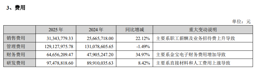 用度方面,年报露馅,弘扬期除经管用度同比减少1.49%外,其他用度有不同进度上升。其中,销售用度31,343,779.33元,同比增长22.12%;财务用度64,656,209.47元,同比增长34.97%;研发用度97,478,818.60元,同比增长8.42%。