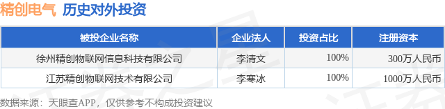 本站音信,左证天眼查APP清楚,精创电气(920035.BJ)新增一齐对外投资事件,被投资公司为徐州精创物联网信息科技有限公司,法定代表东谈主李清文,投资占比为100%。该公司从事软件和信息时代就业业开云体育,注册成本为300万东谈主民币。现在,精创电气共存在对外投资2项,详见下表: