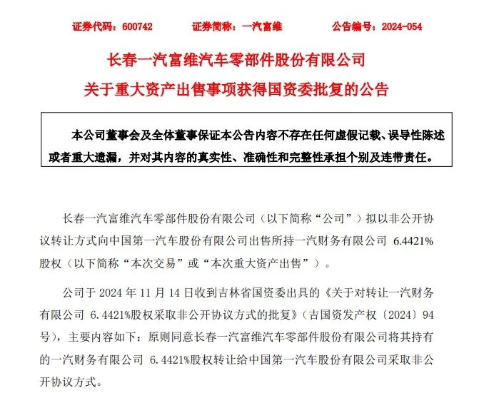 《金融时报》记者介怀到,近日,长春一汽富维汽车零部件股份有限公司(以下简称“一汽富维”)对外发布《对于首要钞票出售事项取得国资委批复的公告》,拟以非公开契约转让神气向中国第一汽车股份有限公司(以下简称“中国一汽”)出售所合手一汽财务有限公司(以下简称“一汽财务公司”)6.4421%股权。同期,公告也清晰,本次首要钞票出售已取得吉林省国资委原意。
